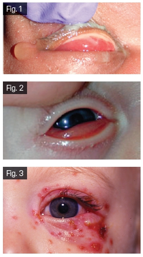 Conjunctivitele virale la nou-născut sunt rare, dar au potențial sever. Atât virusul herpes simplex tipul 1(HSV 1) cât și HSV 2 pot fi incriminate. HSV 1 se transmite prin sărut de la un adult cu infecție activă, iar HSV 2 se transmite prin contact direct în timpul trecerii prin canalul de naștere. Manifestările oftalmice asociază apariția de vezicule pe tegumentul periocular (Fig. 3), iar extinderea infecției poate duce la dermatită, pneumonie, hepatită și chiar meningoencefalită. Terapia constă în medicamente antivirale.