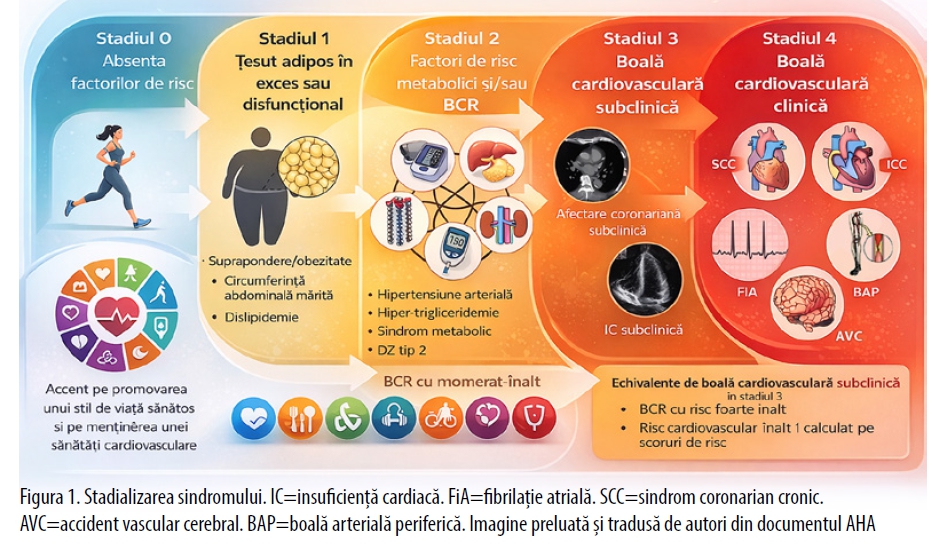 Sindromul CRM este o patologie progresivă, care poate debuta încă din copilărie, sub influența factorilor socio-economici și comportamentali ce favorizează acumularea de țesut adipos în exces. Țesutul adipos disfuncțional progresează adesea rapid către factorii de risc tradiționali (hipertensiune arterială, dislipidemie, diabet zaharat, sindrom metabolic) și către BCR. În timp, aceste comorbidități acționează sinergic și determină apariția aterosclerozei subclinice și deteriorarea treptată a funcției renale, agravând totodată funcția cardiacă. De la stadiul subclinic la prima decompensare clinică este adesea doar un pas. Tocmai această evoluție graduală a justificat introducerea unui sistem de stadializare, menit să permită identificarea pacienților în diverse stadii și să ghideze orientarea strategiilor preventive și terapeutice. Astfel, s-a propus un model cu cinci stadii, reprezentat în figura 1.