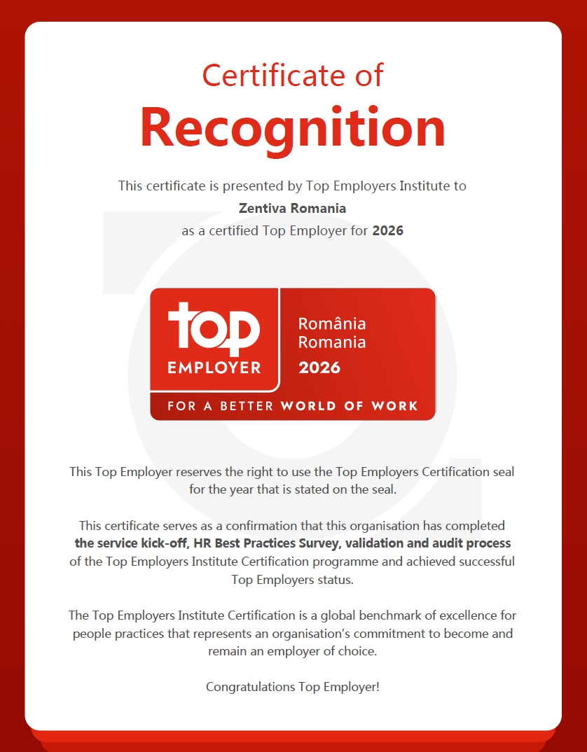 Grupul Zentiva în România a primit certificarea Top Employer pentru al cincilea an consecutiv, reconfirmând angajamentul companiei față de excelența în practicile de resurse umane și dezvoltarea unei culturi organizaționale centrate pe oameni. Distincția reprezintă o recunoaștere internațională acordată organizațiilor care creează un mediu de lucru performant, incluziv și orientat către dezvoltarea și starea de bine a angajaților.