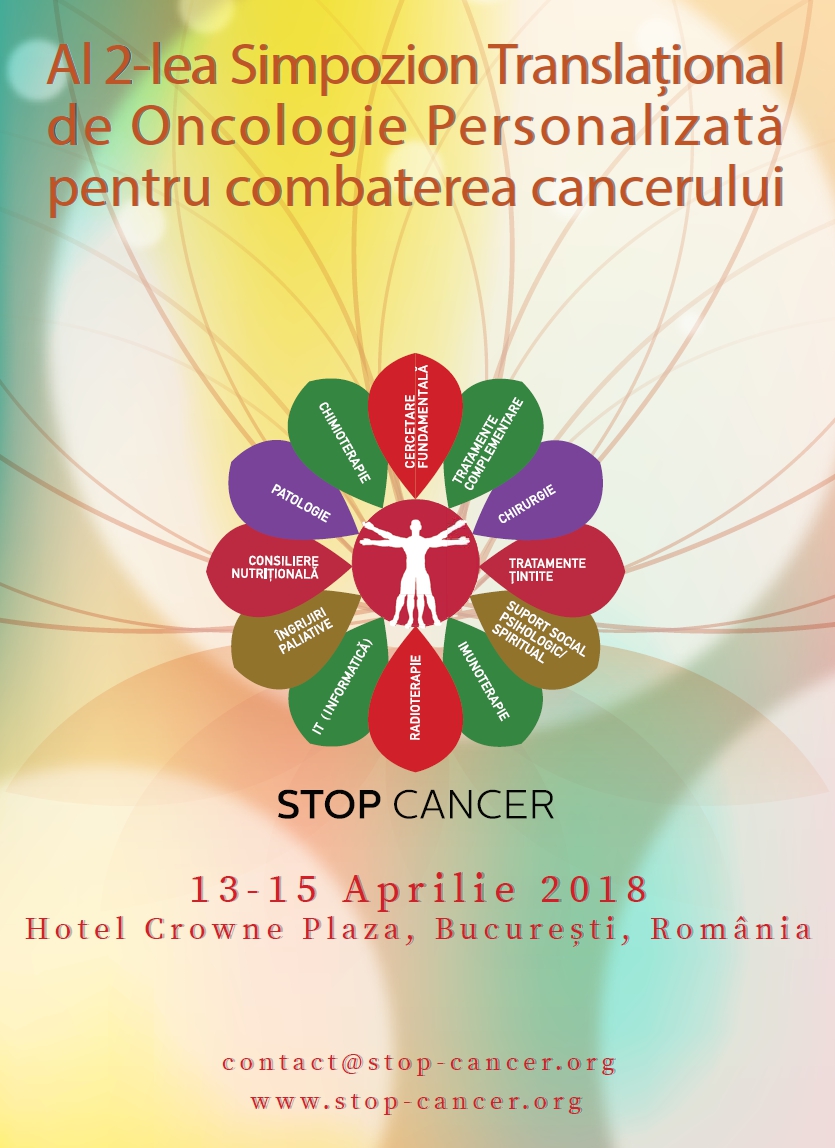 În numele Comitetului de Organizare ne revine o desebită plăcere de a vă invita la al doliea Simpozion Translațional de Oncologie Personalizată pentru combaterea cancerului STOP cancer ce se va desfășura în perioada 13-15 Aprilie 2018, București, România, Hotel Crowne Plaza, Str. Poligrafiei nr. 1.