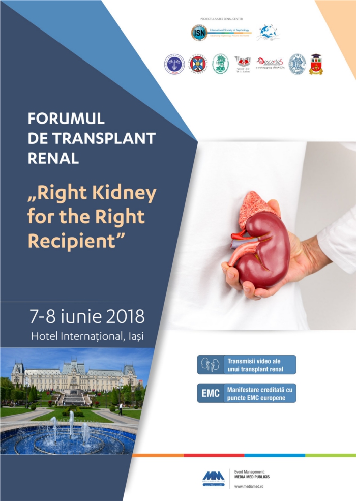 Afisari: 3171Forumul de Transplant Renal – Rinichiul potrivit pentru pacientul potrivit este un eveniment in premiera pentru Romania, la care vor participa lideri in domeniul transplantului renal din tara si din strainatate si in cadrul caruia va fi transmis in direct un transplat renal de la Spitalul C.I. Parhon Iasi.