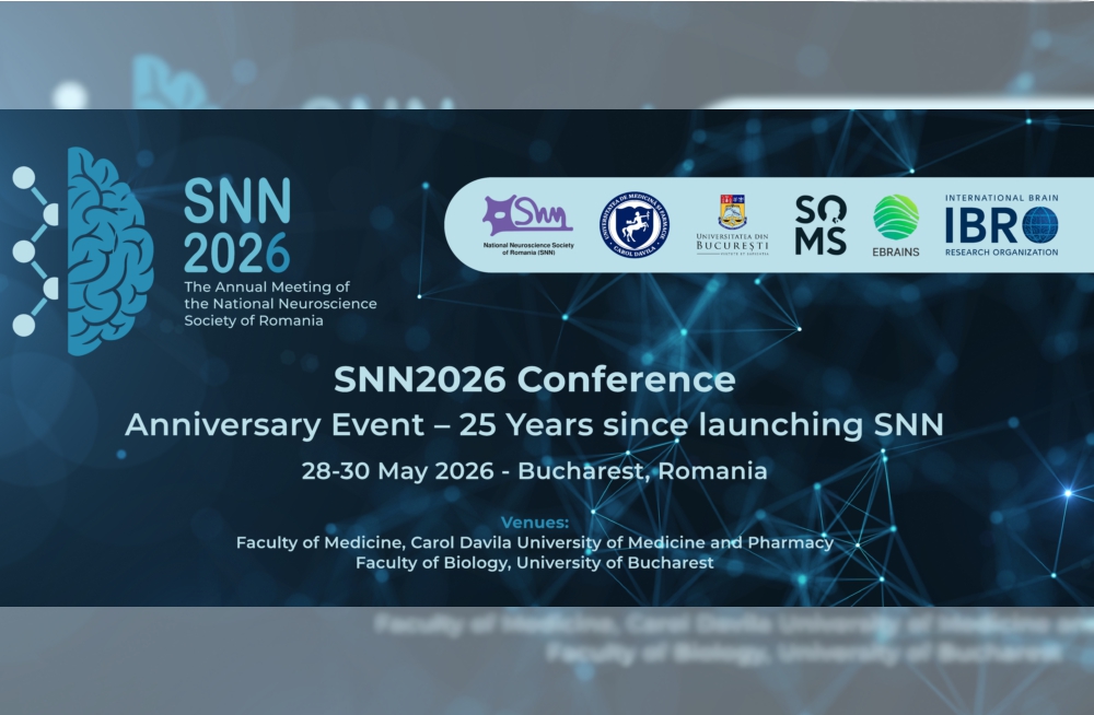 The Annual National Neuroscience Society of Romania (SNN) Conference with international participation, SNN2026 promises a fantastic opportunity to celebrate the 25th years of SNN activity by engaging with cutting-edge neuroscience research, exchanging ideas with leading experts, and exploring the latest advancements in experimental and clinical neuroscience. During the 8 sessions and 6 workshops, SNN2026 conference will cover exciting topics such as brain circuits, neurodegeneration, neuroprotection, neurorecovery, vision, neuropathic pain, gut-brain axis, and computational neuroscience.