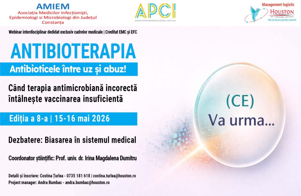 Vă invităm la webinarul de antibioterapie „Antibioticele între uz și abuz!” – ediția a 8-a, care va avea loc în perioada 15–16 mai 2026, sub coordonarea științifică a Prof. univ. dr. Irina Magdalena Dumitru.